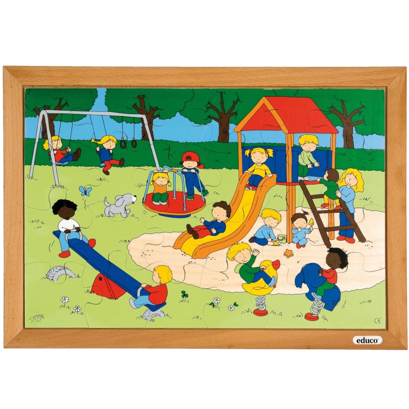 This range shows children's activities. Wooden puzzle about the playground, 24 pieces. Wooden frame: 40 x 28 cm.