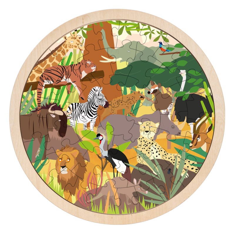 The savannah is a vast region filled with wild animals and unique vegetation. With the jigsaw puzzle Habitats – savannah, children discover how lions, zebras, and giraffes move through this landscape. The illustration shows a lively savannah with large mammals and birds among the grass and trees. The round shape of the puzzle highlights the vastness of the environment.