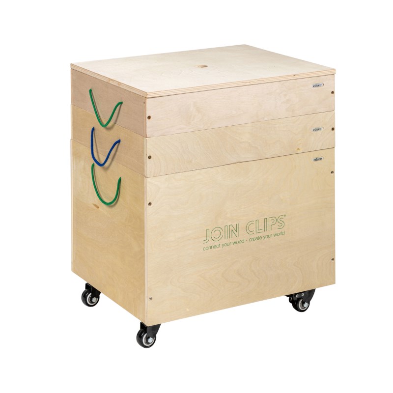 Marble track bundle – JOIN CLIPS® system. lets you build complete marble tracks right away. The combination of planks, clips, and marble run elements makes it possible to create tunnels, curves, and finish lines. Children discover how gravity and speed work while experimenting with the ideal slope. The planks are stored in a mobile stacking box that fits with other stackable JOIN CLIPS® system boxes. The system is compatible with wooden planks from other brands.