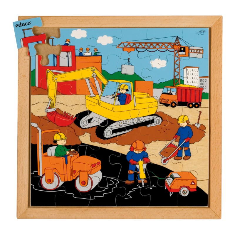 Wooden puzzle Road building from the series 'Street action'. Contains 36 pieces. Wooden frame: 34 x 34 cm.